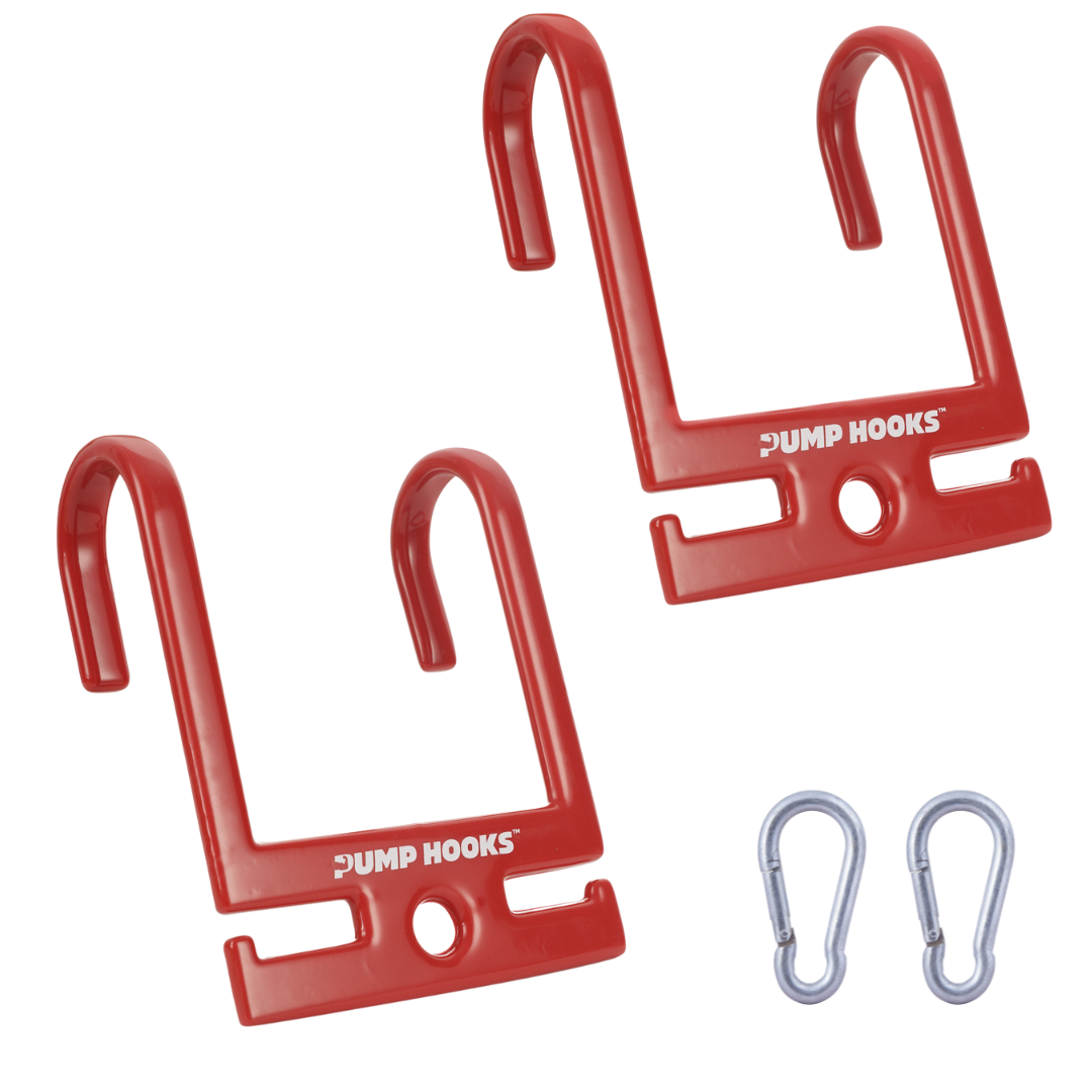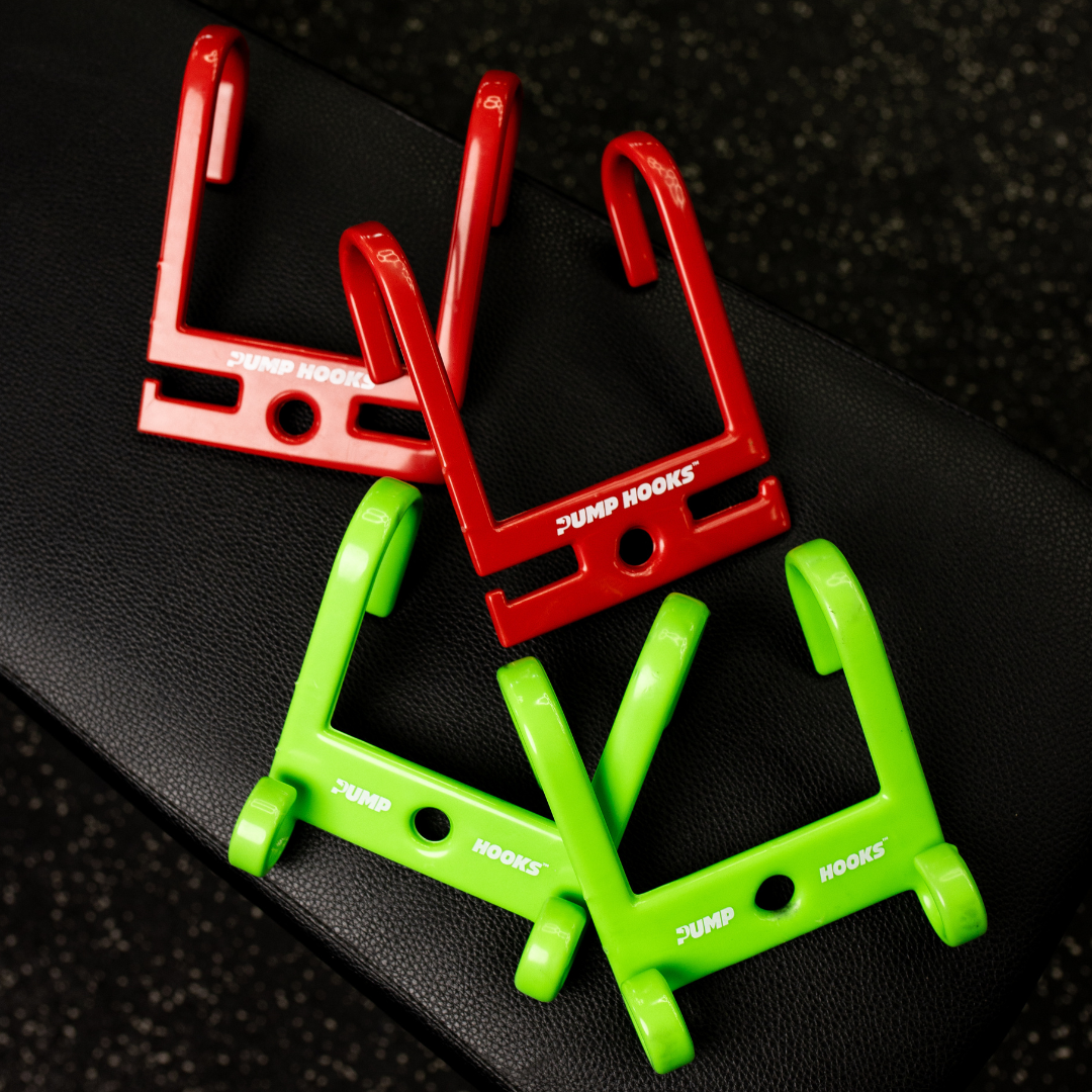 Pump Hooks are made of solid steel core with a full vinyl-dipped layer to protect your dumbbells, barbells, and kettlebells.